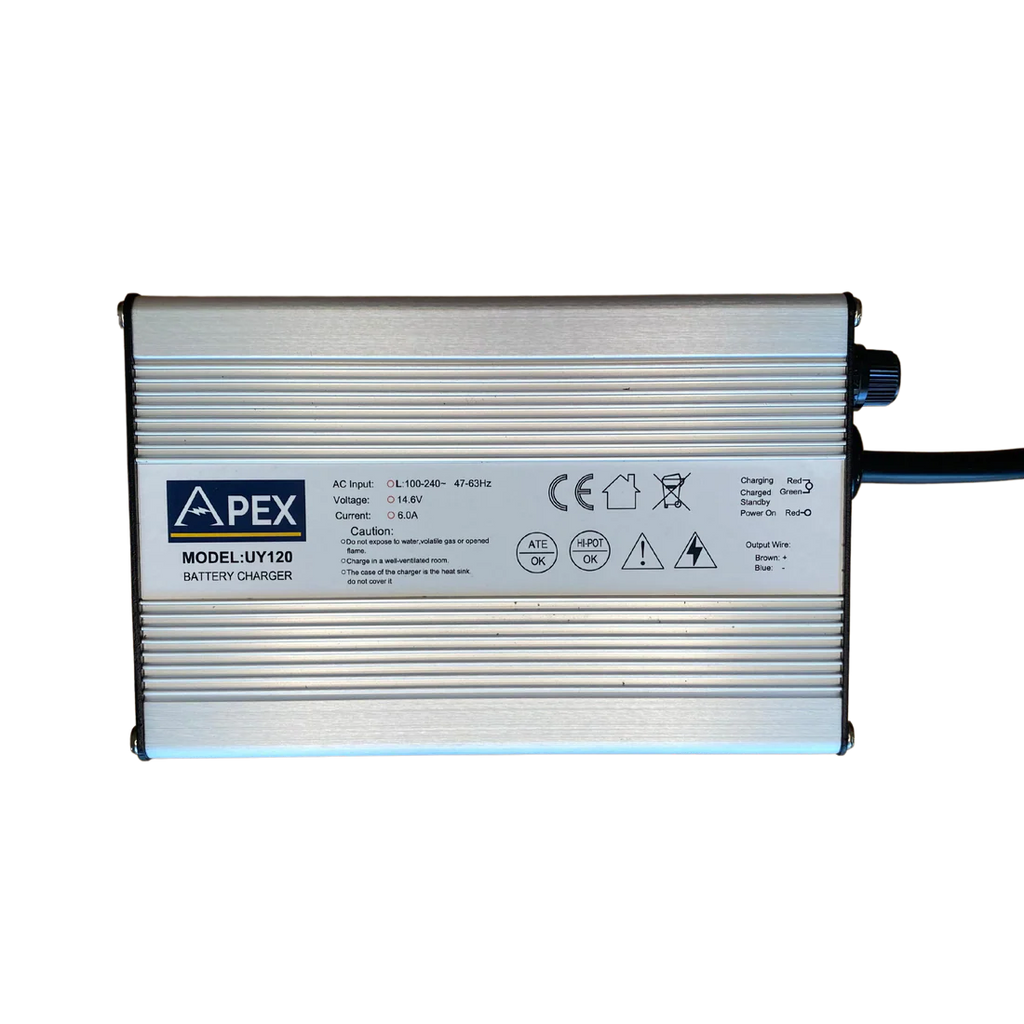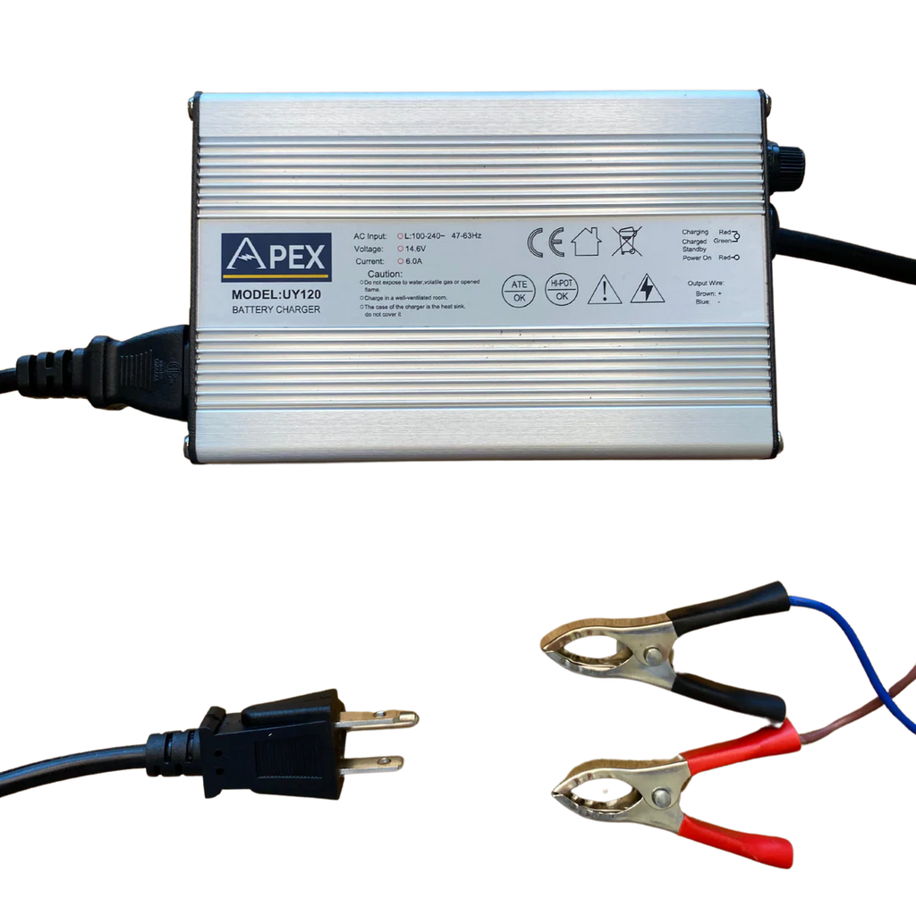 Optimize your charging process with the Apex Lithium's 12V 6A Charger, designed by industry experts for efficient and safe charging of your lithium iron phosphate batteries. With a charging rate of 6A, it effectively charges your 12V batteries, ensuring they are always ready for use.