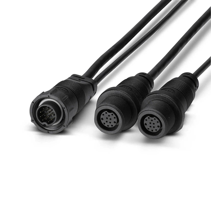 The 14 M ID SIDB Y cable allows for the installation of a separate 2D transducer paired with a Humminbird MEGA Imaging or non-MEGA Imaging transducer and connect both transducers to a single Humminbird control head. This y-cable provides the ability to install a separate high-speed Humminbird 2D transducer for high-speed depth reading and sonar performance. Alternatively, this cable can also be used to add an accessory Airmar® 2D transducer to a Humminbird control head that also has a Side or Down Imaging transducer connected at the same time. This cable supports Transducer ID for automatic recognition and easy setup of Airmar® accessory transducers.