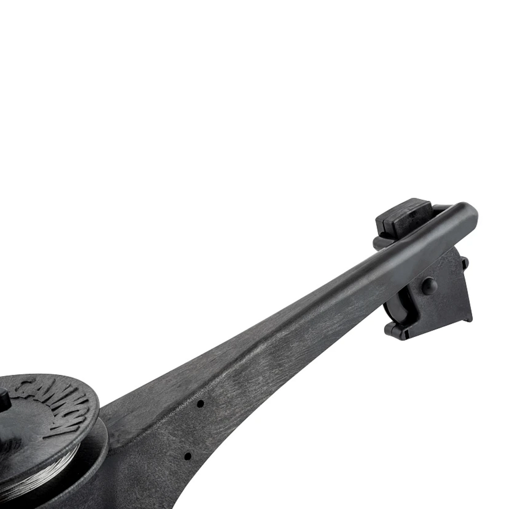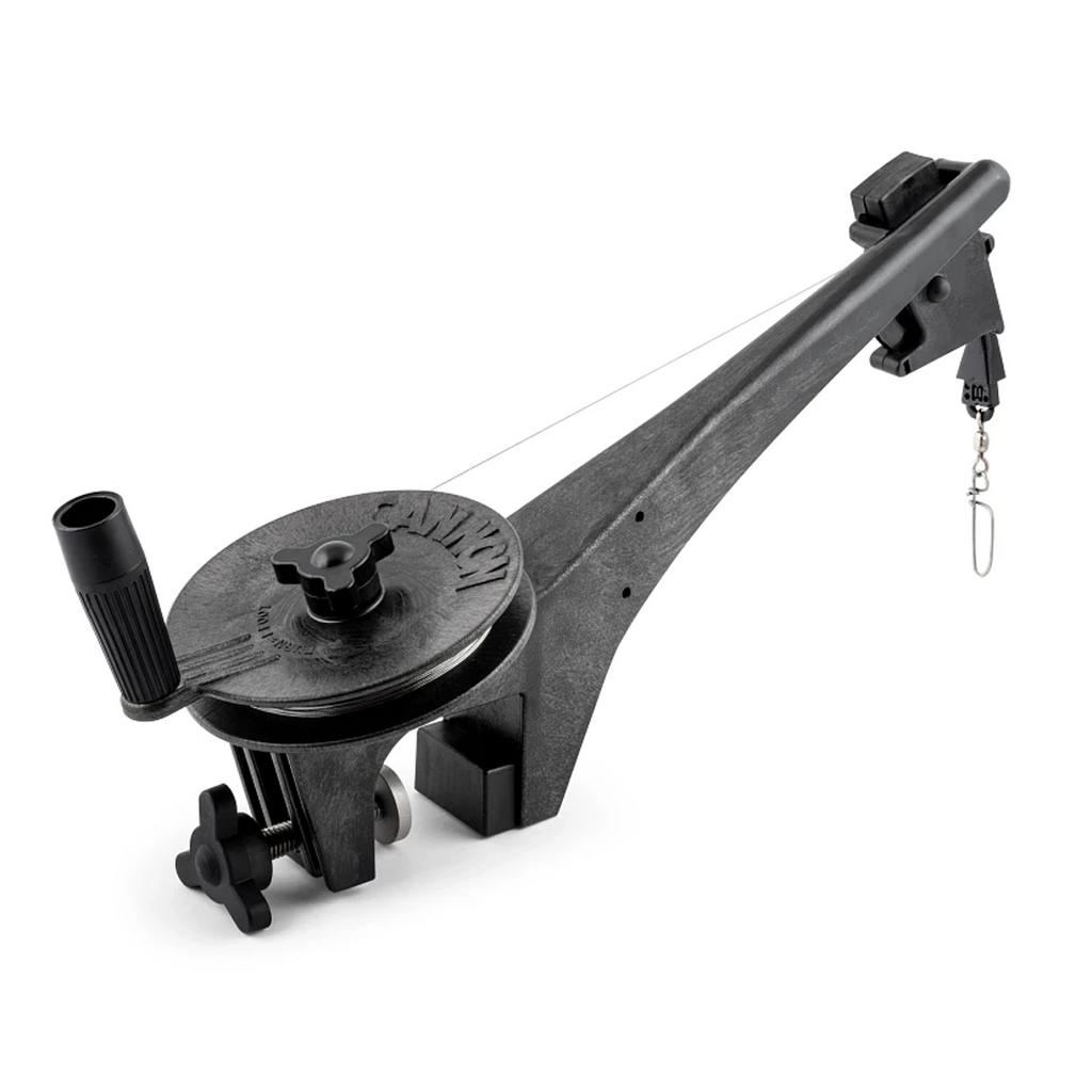A horizontal reel/brake, 100' of 135-lb of stainless steel cable and a swivel-head depth counter come standard on this manual downrigger.
