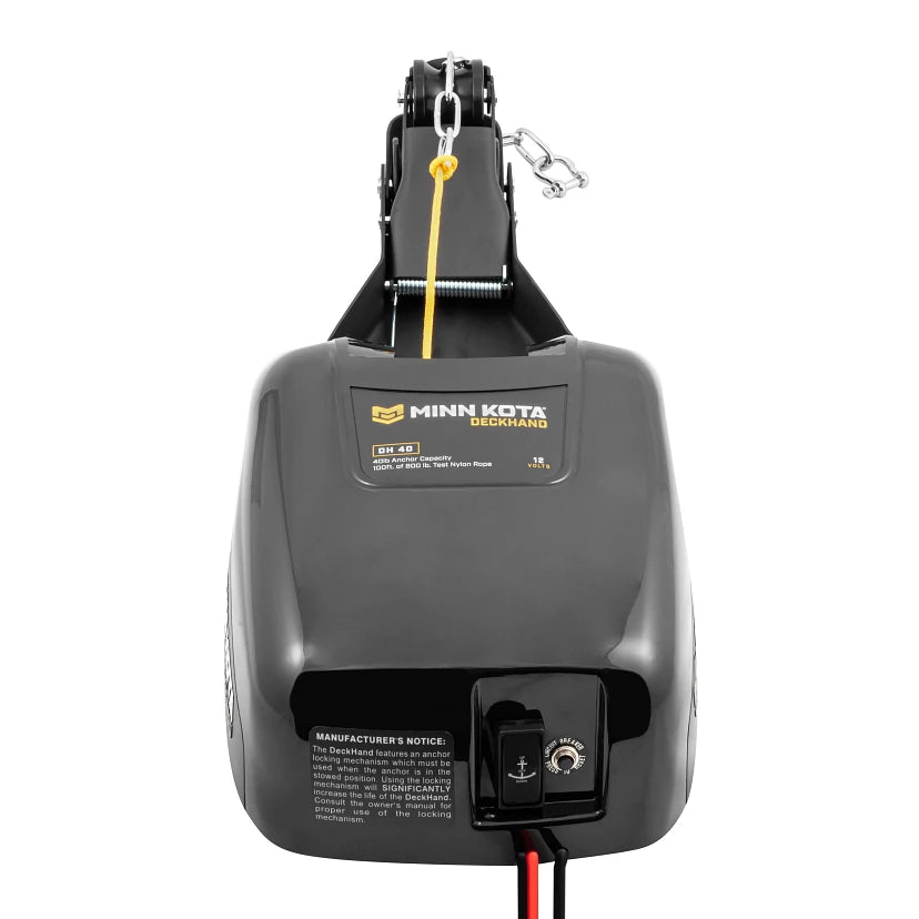 Automatically raise and lower your anchor at the touch of a button. DeckHand 40 has a 40-lb anchor capacity (anchor not included). Pre-spooled with 100 feet of 800-lb test nylon rope. Universal davit can be mounted at base of DeckHand or in remote position on boat deck. Davit also stows anchor horizontally to eliminate anchor swing. Anchor shackle allows for quick changes between anchors. A special anti-drag system senses the bottom to allow for controlled drifting. Runs on 12-volt battery (not included). Remote accessory (sold separately) allows for 25' corded remote operation. DH 40 is designed to work with anchors weighing at least 20 lbs and not more than 40 lbs.